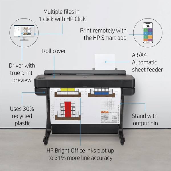 Eliminate the need to wait by the printer with our high-speed printing capability, which can produce A1/D plots in as fast as 25 seconds. Increase your productivity by saving time throughout the entire printing process, as you can now print your projects up to 2 times faster. Additionally, you can conveniently print your jobs and manage your plotter from anywhere and at any time using the HP Smart app.