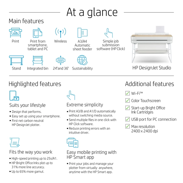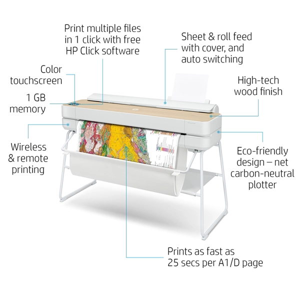 Avoid waiting by the printer with high-speed printing that delivers results as fast as 25 seconds per A1/D plot. Moreover, be more productive and save time from job prep to final print by printing your projects up to 2x faster. Additionally, print your jobs and manage your plotter from virtually anywhere, anytime with the HP Smart app, offering unmatched convenience and flexibility.